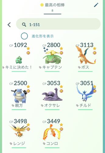 だんだん増えてきた。 第1世代からは御三家と3鳥。 あとやたらと好きなベトベトンが先行。 第2世代からはデンリュウとダンロップ。 基本的にはフル強化してる中で好きなポケモンを。第3世代以降はリアルタイムで接していないので相棒にしたいという気持ちそ…